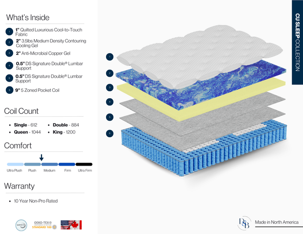 • Copper Gel Layer: Infused with antimicrobial copper for enhanced cooling, hygiene, and support.
